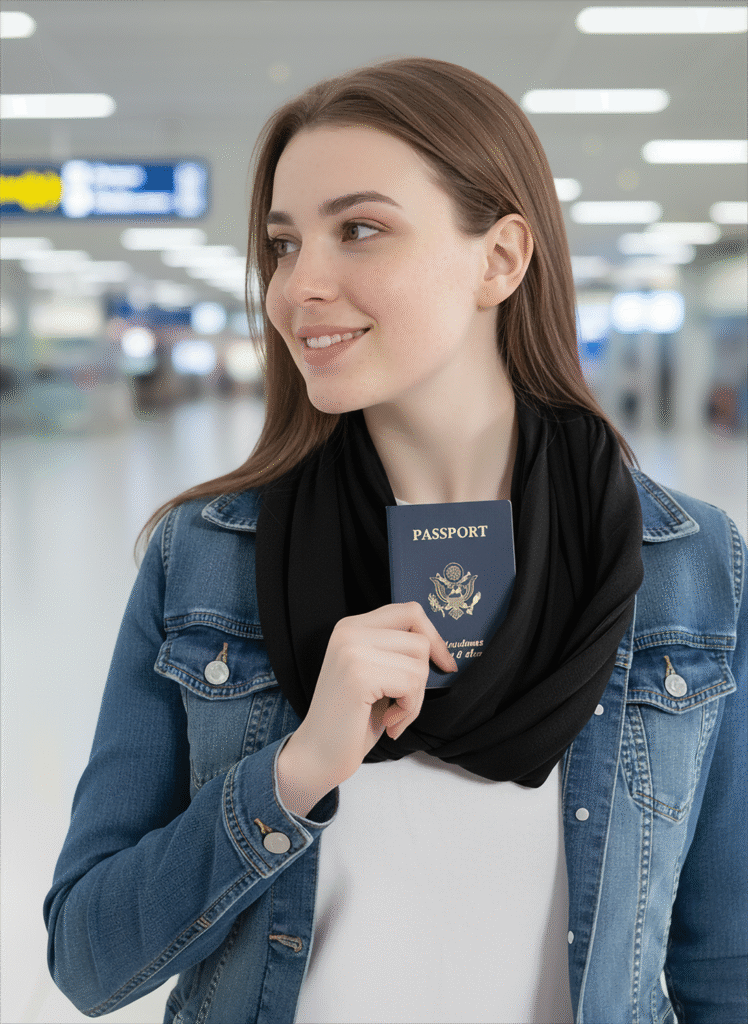 Elzama Solid Color Infinity Scarf with Hidden Zipper Pocket, Black